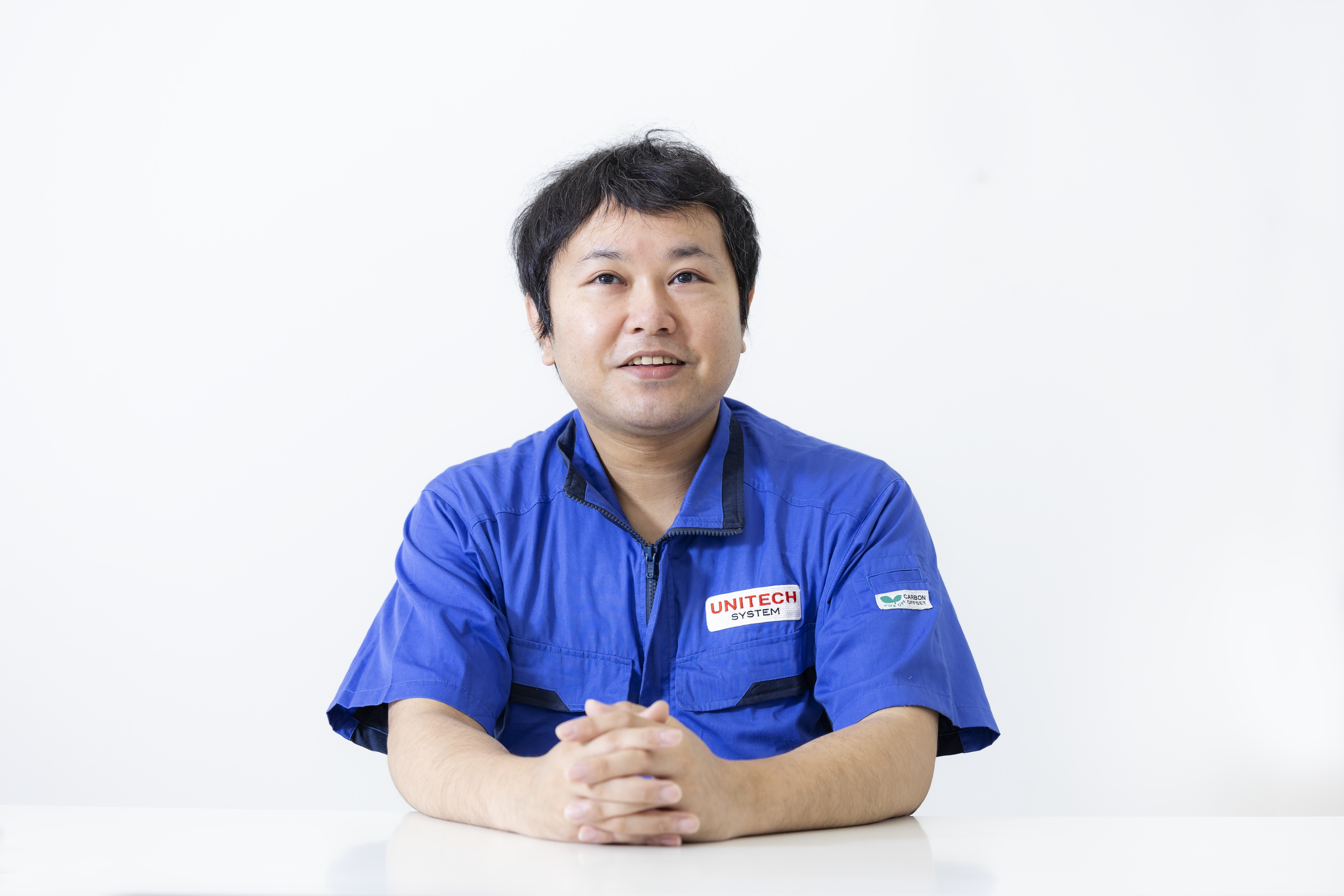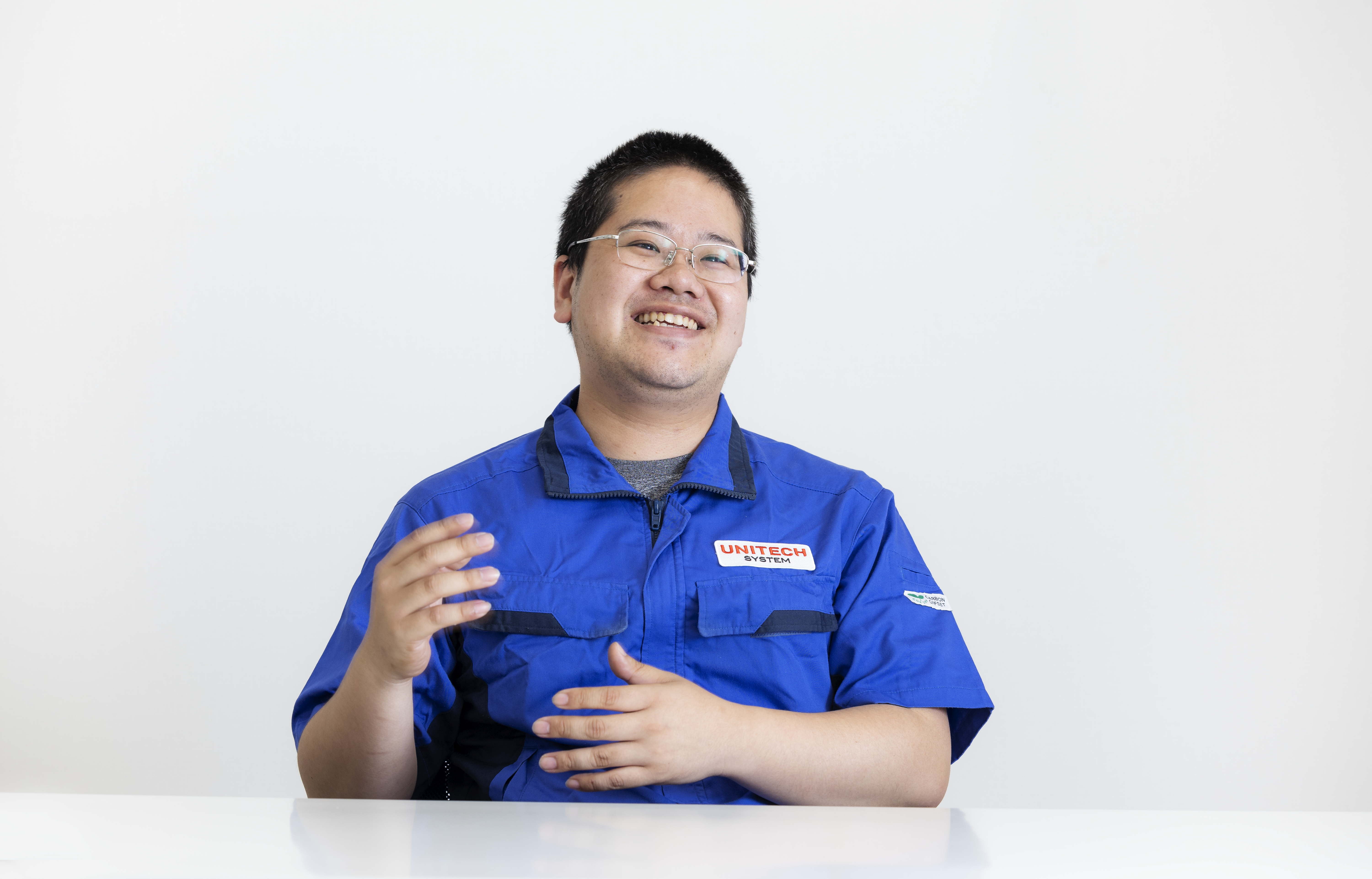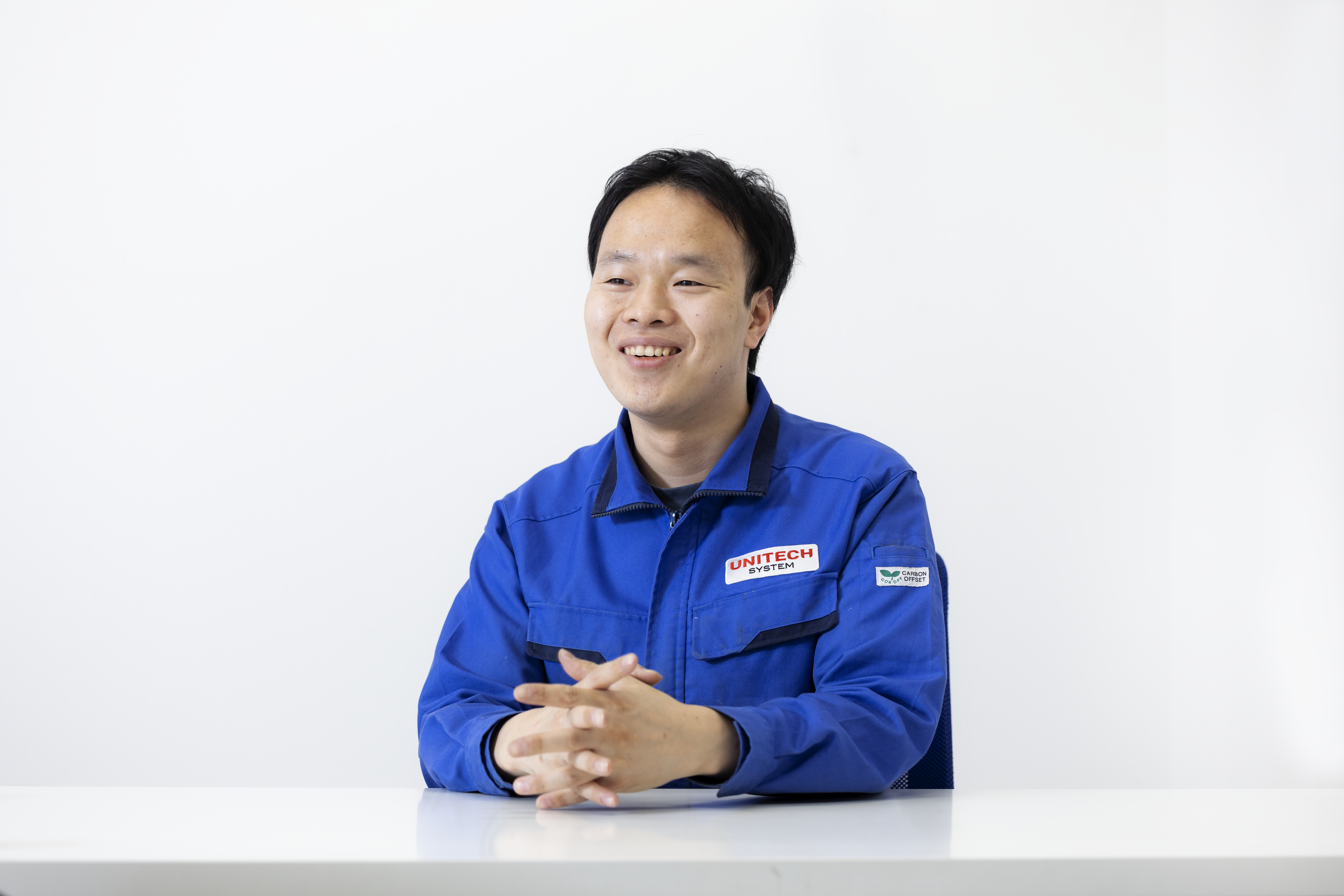 我负责的是客户工厂的机械设备维修。接触机械是很专业的工作,但我其实毫无经验。我之前在一家药妆店工作了大约两年,通过店内的商品陈列、布局调整等业务,发现自己很享受与“物品”打交道的过程,于是开始寻找与制造业相关的工作,来到了UNITECH SYSTEM。使我倍感兴奋的不是制造机器,而是修理机器。正因为是从零开始,让我有机会学习各种知识,切实感受到了自己的成长。彻底发挥所学的技能与知识,每当顺利修好机器时,总是带给我非常大的成就感。